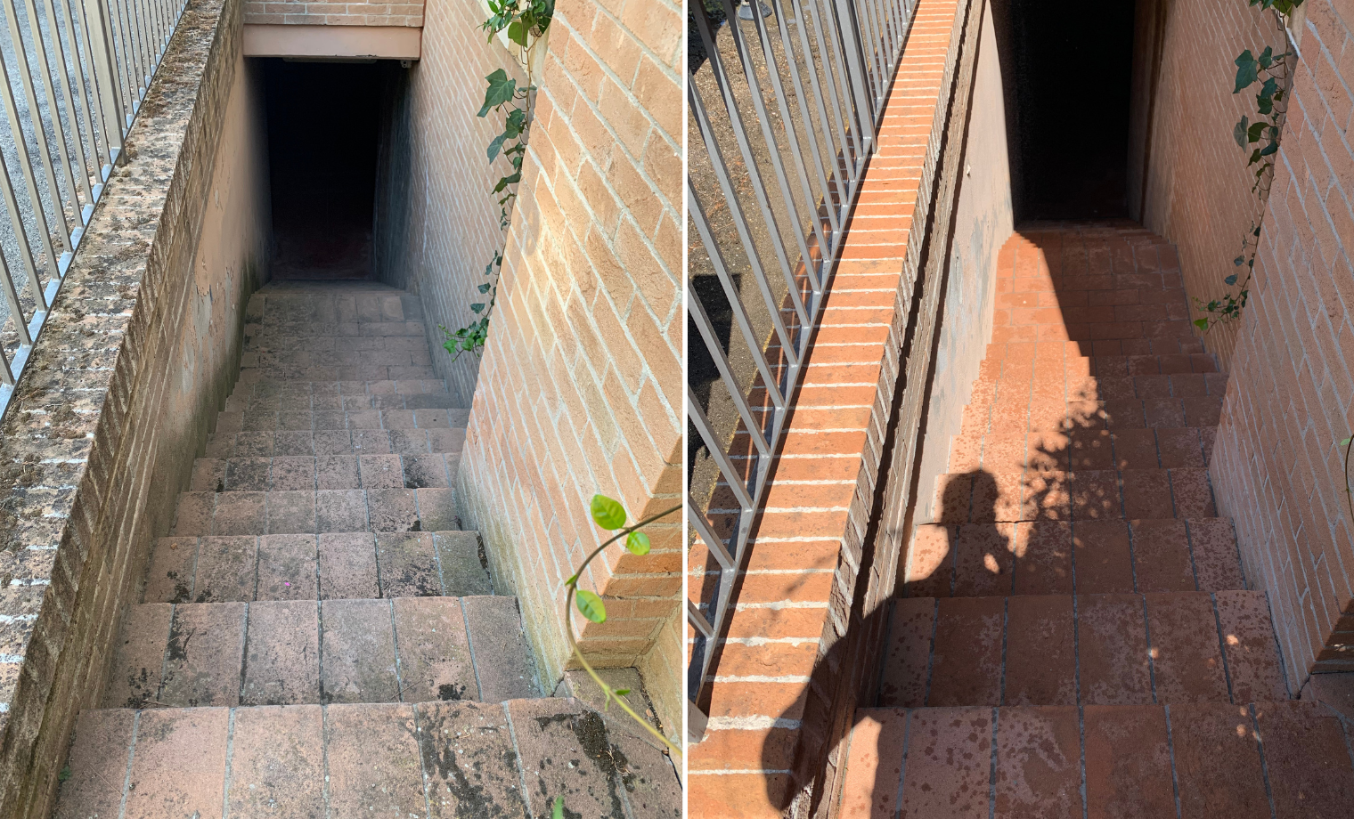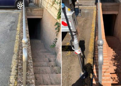 Per la riqualificazione delle superfici esterne e dei pavimenti comuni del condominio, abbiamo alternato l’uso della lancia a ventaglio con una lancia a getto rotante, particolarmente utile per affrontare le incrostazioni più tenaci presenti nelle zone ad alto calpestio, come vialetti, cortili e zone parcheggio.